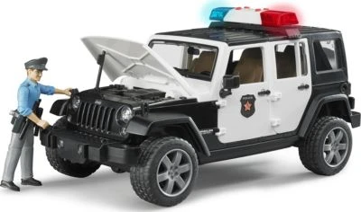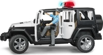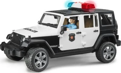 Der Jeep Wrangler Unlimited Rubicon ist für diesen Alltag im attraktiven Police-Look gestaltet und besitzt zahlreiche Funktionen, die fast grenzenlosen Spielspaß ermöglichen. Neben dem 2-teilig abnehmbaren Segmentdach, lassen sich auch die Motorhaube, die Hecktür und alle vier Türen öffnen. Selbstverständlich sind die Platzverhältnisse so, dass auch vier BRUDER bworld-Figuren in das Fahrzeug passen. Alternativ zu der Vollbesetzung ist die Rücksitzbank herausnehmbar, um dann im Ladebereich über die BRUDER-Normverbinder Zubehör aufnehmen zu können. Die Zusatzlenksäule dient dem einfachen Lenken durch die Dachluke und kann bei Nichtverwendung im Fahrzeugboden verstaut werden. Die Achsen sind geländewagenüblich gefedert und die profilierten Räder besitzen Felgen in attraktiver SUV-Optik. Durch die Frontschnittstelle, an der z.B. die zusätzlich erhältliche Seilwinde befestigt werden kann, und die abnehmbare Anhängerkupplung, sind den Erweiterungsmöglichkeiten in der BRUDER-Welt keine Grenzen gesetzt. Die Police-Version des Jeep-Modells verfügt über ein neu entwickeltes Light & Sound Modul, welches mit vier Funktionsknöpfen ausgestattet ist.