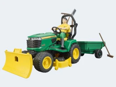 Die für Komfort, Bequemlichkeit und Leistungsfähigkeit entwickelten John Deere-Aufsitzrasenmäher sind das Optimum in Sachen Rasenpflege. Der John Deere X949 glänzt hierbei mit außerordentlichem Bedien- und Fahrkomfort. Dieser Rasentraktor ist der neueste Zugang in der breiten Palette von Nutz- und Kommunalfahrzeugen von BRUDER. Das in höchstem Maße detailgetreue Modell verfügt über den, für diese Serie typischen Überroll Bügel und das modern gestaltete Cockpit. Das Dreifach-Mähwerk ist höhenverstellbar und abnehmbar. Für den Transport von Werkzeug und Gartenabfällen ist bei diesem Set ein Kippanhänger enthalten, der sich im Handumdrehen ankuppeln lässt. Für noch mehr Spielspaß ist auch der passende Gärtner dabei – somit kann die Arbeit gleich starten. Als schöne Erweiterung für dieses Set gibt es für BRUDER Fans noch den Gärtner mit Rasenmäher (Art.-Nr. 62013) im Sortiment.
